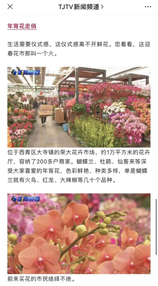 新年春意,花市先知。随着春节的临近,不少市民来到位于西青区大寺镇的容大花卉市场购买鲜花装点家居,为即将到来的兔年春节增添喜庆气氛。近日,天津电视台《天津新闻》刊播新闻《津城年味浓》,报道了西青区大寺镇荣大花卉市场年宵花走俏,满足市民不同消费需求。