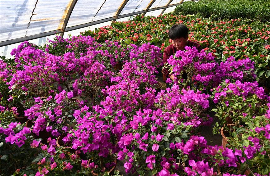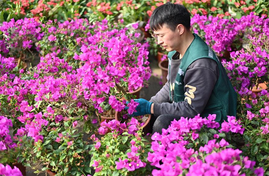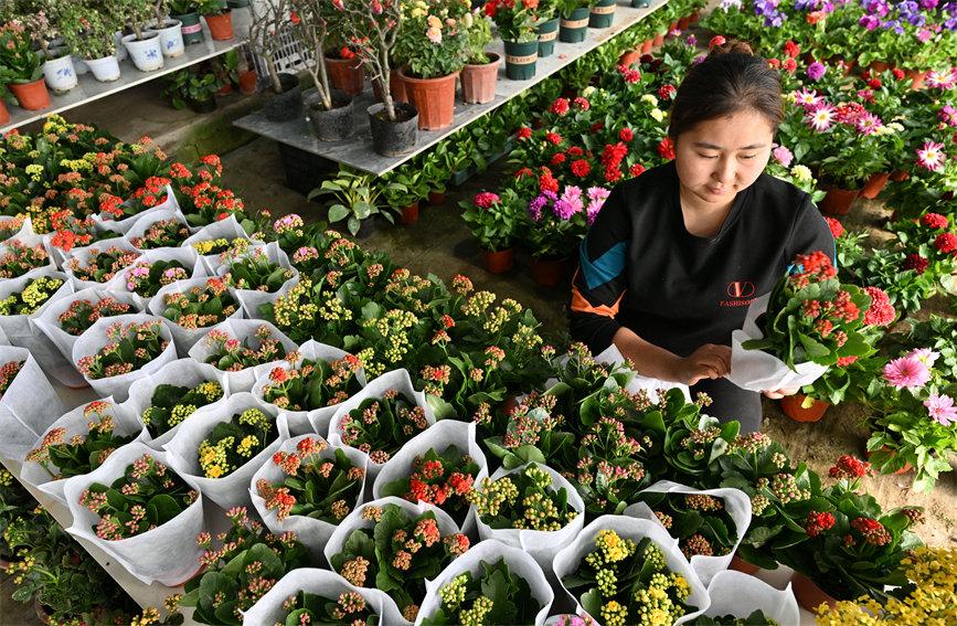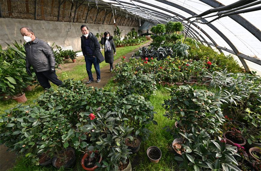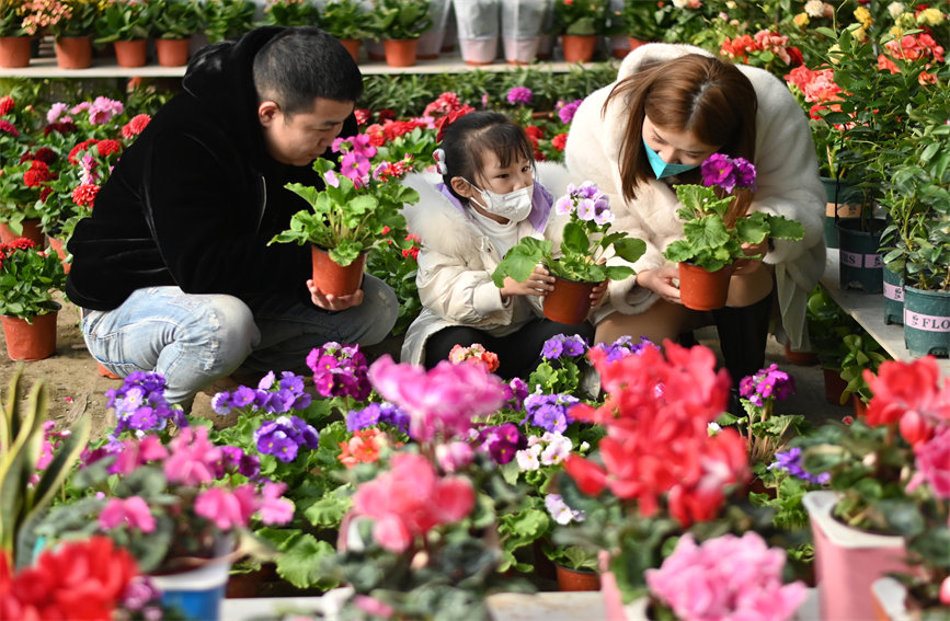 日前,市民在新疆巴音郭楞蒙古自治州(简称巴州)库尔勒市的一处花卉基地选购花卉。 立春节气过后,气温开始慢慢回升,新疆巴州库尔勒市各大花卉基地和花卉市场内姹紫嫣红,鲜花竞相绽放,市民三五成群结伴而来精心挑选,拍照、观赏,乐在其中,花卉市场热闹异常。(图片由确·胡热拍摄)