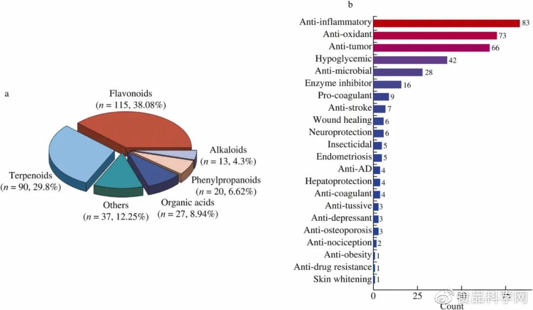 本文综述了55种花卉植物中的302个活性成分,其中黄酮类化合物115个(1–115),占38.08%;萜类90个(116–205),占29.8%;苯丙素类20个(206–225),占6.62%;生物碱类13个(226–238),占4.3%;有机酸27个(239–265),占8.94%;其他类37个(266–302),占12.25%。综述发现,黄酮类和萜类化合物是花卉植物的主要活性成分(图1a)。花卉植物的22种生物活性功能,包括抗氧化(70)、抗炎(83)、抗肿瘤(66)、降血糖(42)、抗菌(28)、酶抑制剂(16)、促凝血(9)、抗中风(7)、伤口愈合(6)、神经保护(6)、杀虫药(5)、抗子宫内膜异位症(5)、抗阿尔兹海默症(4)、肝保护(4)、抗凝血剂(4)、镇咳(3)、抗抑郁(3)、抗骨质疏松(3)、抗伤害(2)、抗肥胖(1)、抗耐药性(1)和皮肤美白(1)活性。302个化学成分的生物活性主要集中在抗炎、抗氧化、抗肿瘤和降血糖活性(图1b)。