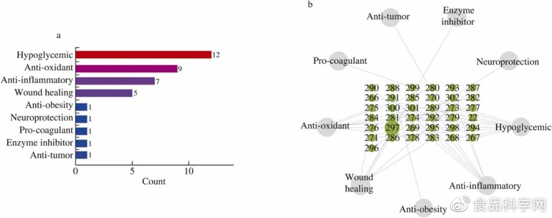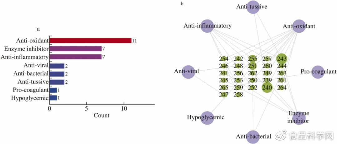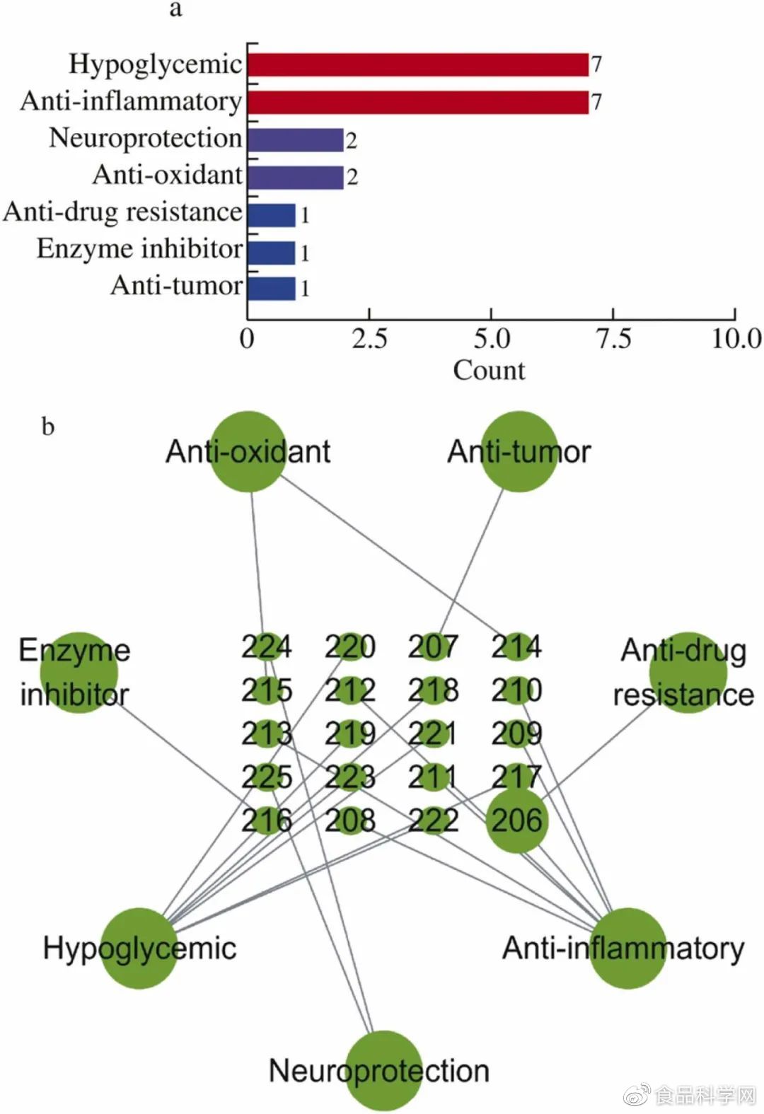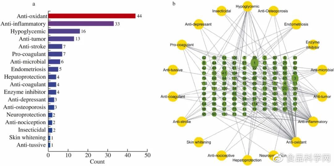 图2(a)黄酮类的生物活性,(b)黄酮类与生物活性之间的关系网络