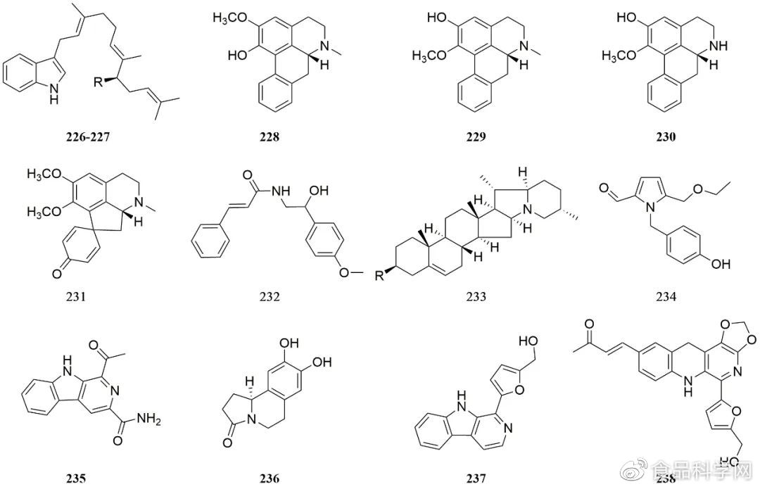 本文综述了20个生物碱类(226–238),抗AD是生物碱类的主要生物活性(图8a)。构建关系网络以揭示生物碱类与各种生物活性之间的关系(图8b)。生物碱类的化学结构如图9。