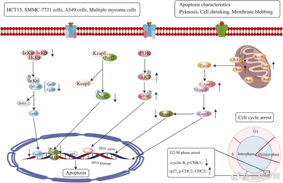 花卉的生物活性成分在抗肿瘤活性中起着重要作用,其抗肿瘤机制包括NF-κB、AKT/mTOR、Nrf2和线粒体凋亡途径的调节(图16)。