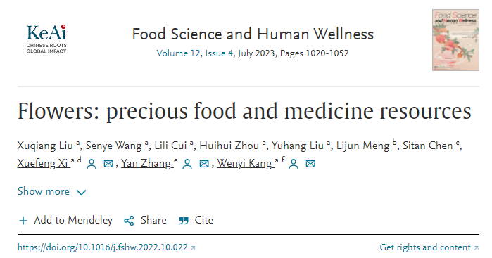 LIU X Q, WANG S Y, CUI L L, et al. Flowers: precious food and medicine resources[J]. Food Science and Human Wellness, 2023, 12(4): 1020-1052. DOI:10.1016/j.fshw.2022.10.022.