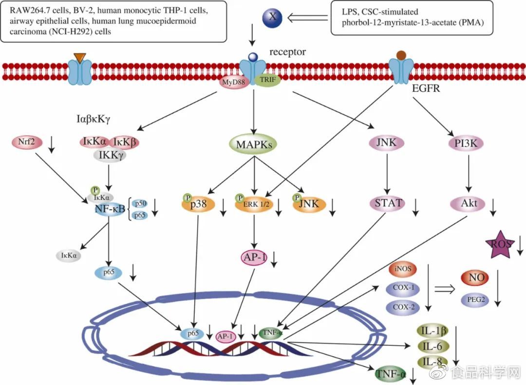 抗炎活性是花卉植物活性化学成分的主要生物活性之一。抗炎机制包括MAPK和NF-κB的调节以及JAK、EGFR和Nrf2信号通路(图15)。