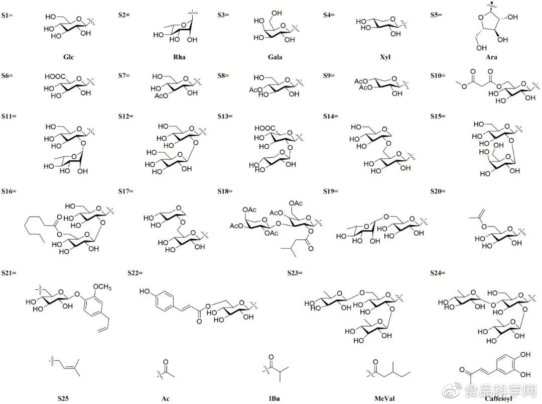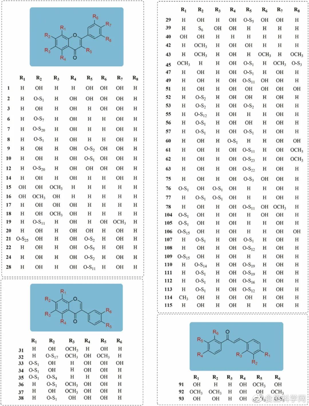 本文综述了花卉中的115个黄酮类化合物(1-115),包括黄酮、黄酮苷和黄酮衍生物。主要生物活性为抗氧化、抗炎和降血糖活性(图2a)。此外,还建立了黄酮类化合物与生物活性之间的关系网络。化合物1、3、20、41具有多种生物活性(图2b)。黄酮类的化学结构如图3所示