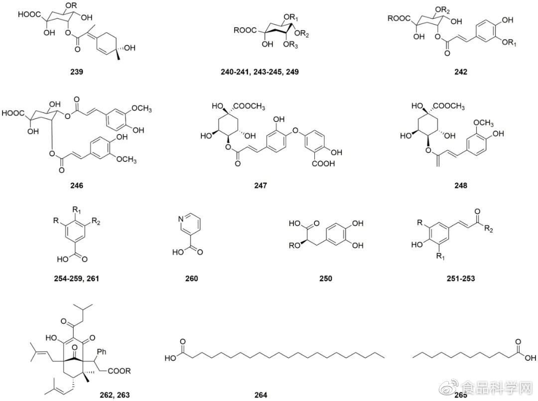本文综述了28个生物碱类(239–265),有机酸与生物活性的关系网络表明,抗氧化、抗炎和酶抑制剂是有机酸的主要生物活性。化合物240、243、251和255同时具有多种生物活性(图10a和b)。有机酸的化学结构如图11所示。