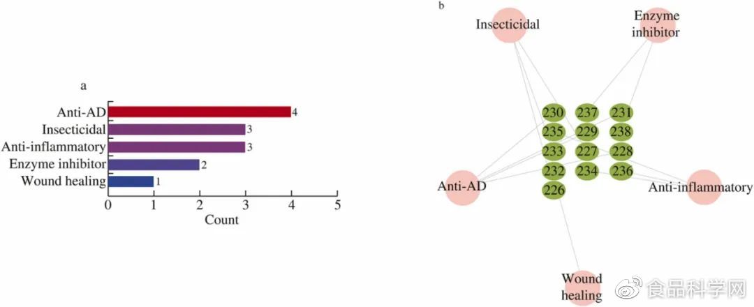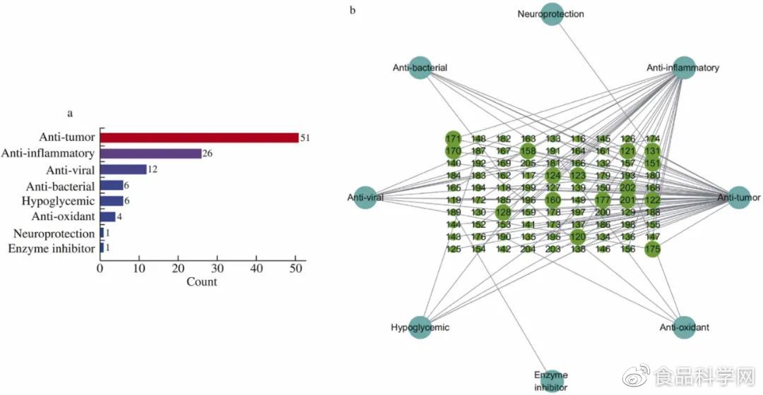 图12(a)其他类型化合物的生物活性,(b)其他类型化合物与生物活性之间的关系网络