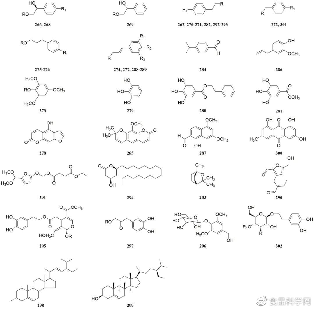 本文综述了36个其他类型活性化合物(266–302),其他类型—生物活性关系网络表明,抗氧化、抗炎和酶抑制是其他生物的主要生物活性。化合物297具有多种生物活性(图12a和b)。其他化合物的化学结构如图13所示。