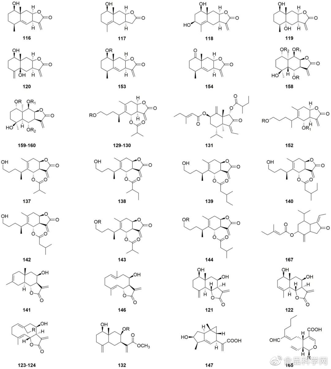 本文综述了花卉中90个活性萜类化合物(116–205),包括单萜、倍半萜、环烯醚萜和三萜。抗肿瘤、抗炎和抗病毒是萜类化合物的主要生物活性(图4a)。萜类生物活性关系网络表明,萜类(121、122、123、124、128、131、151、160、170、171、175、177、201和202)具有多种生物活性。此外,抗肿瘤、抗炎和抗病毒是萜类化合物的主要生物活性(图4b)。萜类化合物的化学结构如图5所示。
