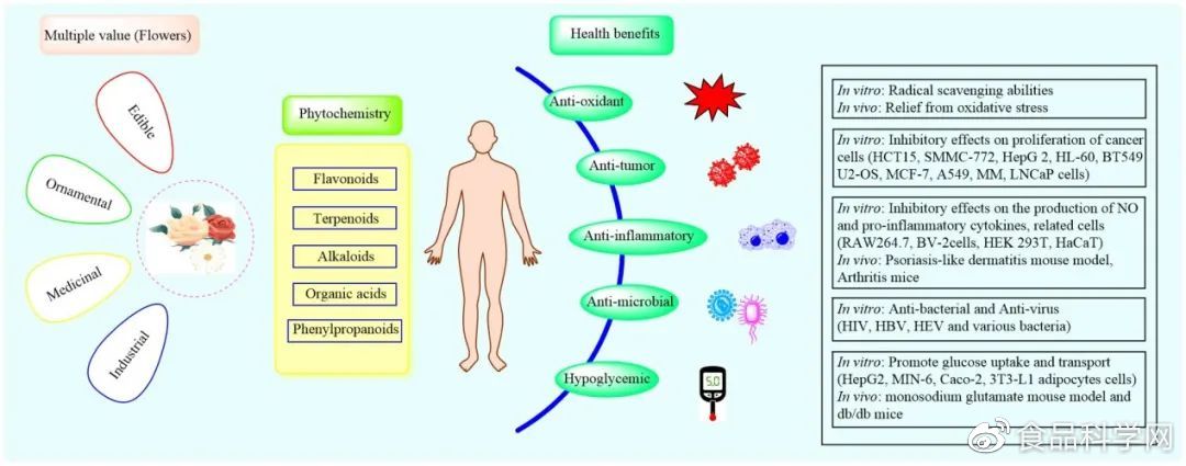 在中国,国家卫生部先后公布了10种具有“药食两用”的花卉,如紫丁香花等。此外,金银花、菊花、玫瑰、灰毡毛忍冬和番红花等药用花卉达100多种,具有重要的药用价值。花卉因富含多种生物活性成分,包括类黄酮、萜类、生物碱和有机酸,因而具有广泛的生物活性,包括抗氧化、抗炎、抗肿瘤、降血糖、抗菌和抗病毒等作用。然而,花卉的功能价值并没有得到足够的重视。