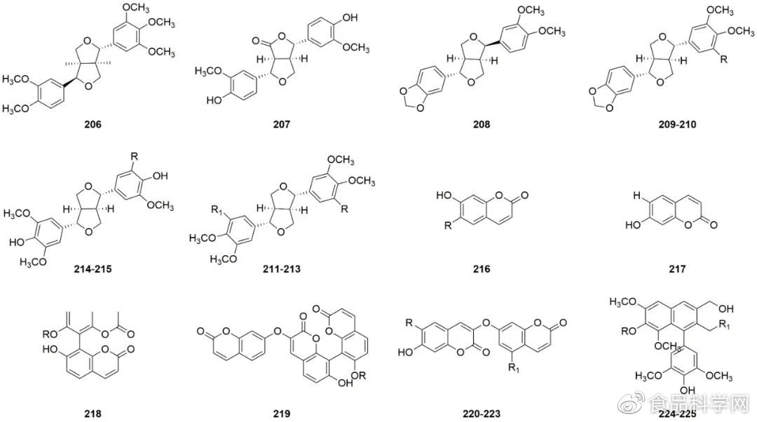 本文综述了20个苯丙素类化合物(206–225),包括木脂素和香豆素,苯丙素类与生物活性之间的关系网络表明,降血糖和抗炎活性是苯丙素类的主要生物活性,化合物206也表现出多种生物活性(图6a和b)。苯丙素类的化学结构如图7所示。