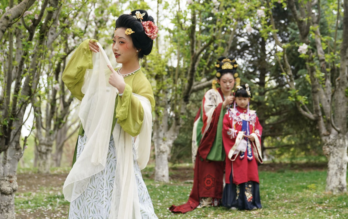 一大早,世界花卉大观园里已经是衣香鬓影,汉服飘飘。“唐朝”的妈妈“汉朝”的女儿,“额黄”“花钿”点缀脸上,“将军”“书生”满地走……汉服“破圈”,人人皆“同袍”。