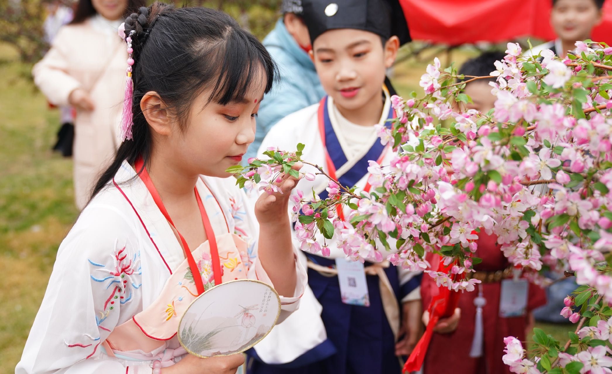 小朋友们穿上汉服赏春花,感受传统文化之美。