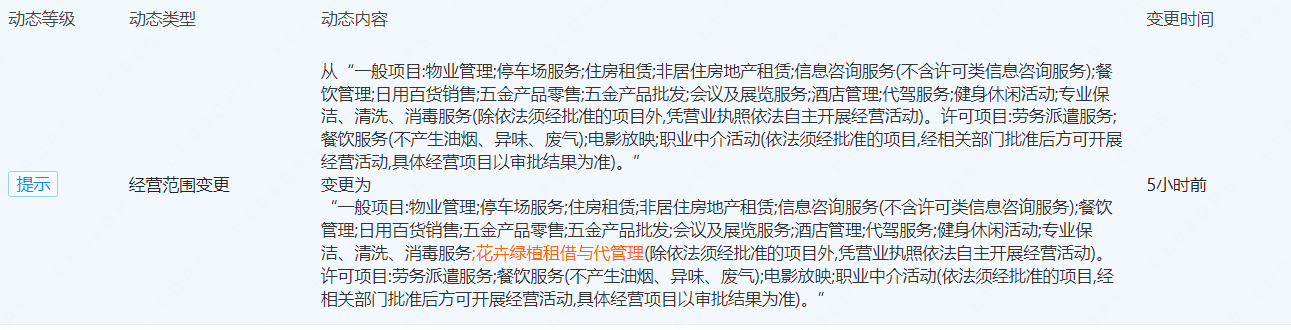 乐居财经 兰兰 4月26日,浙江耀江物业管理有限公司(以下简称“耀江物业”)近日经营范围新增花卉绿植租借与代管理。