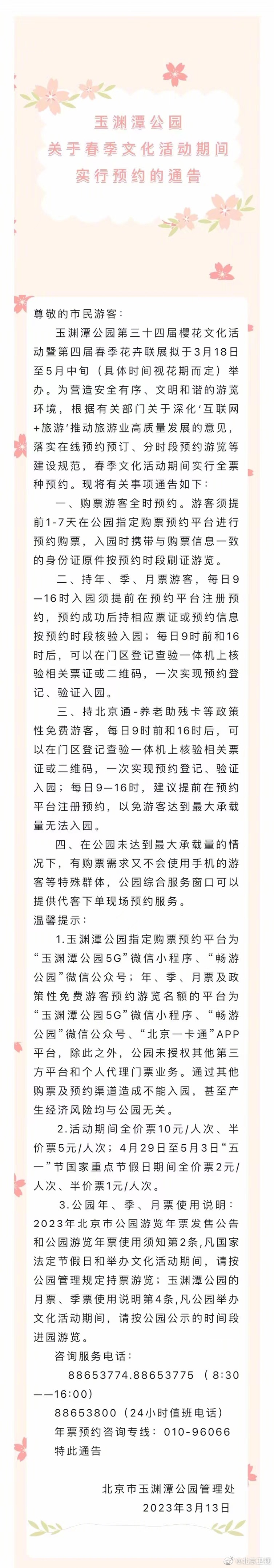玉渊潭公园第三十四届樱花文化活动暨第四届春季花卉联展拟于3月18日至5月中旬举办