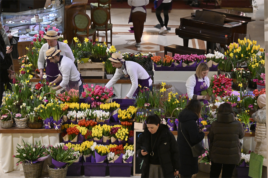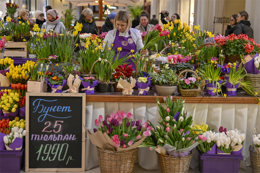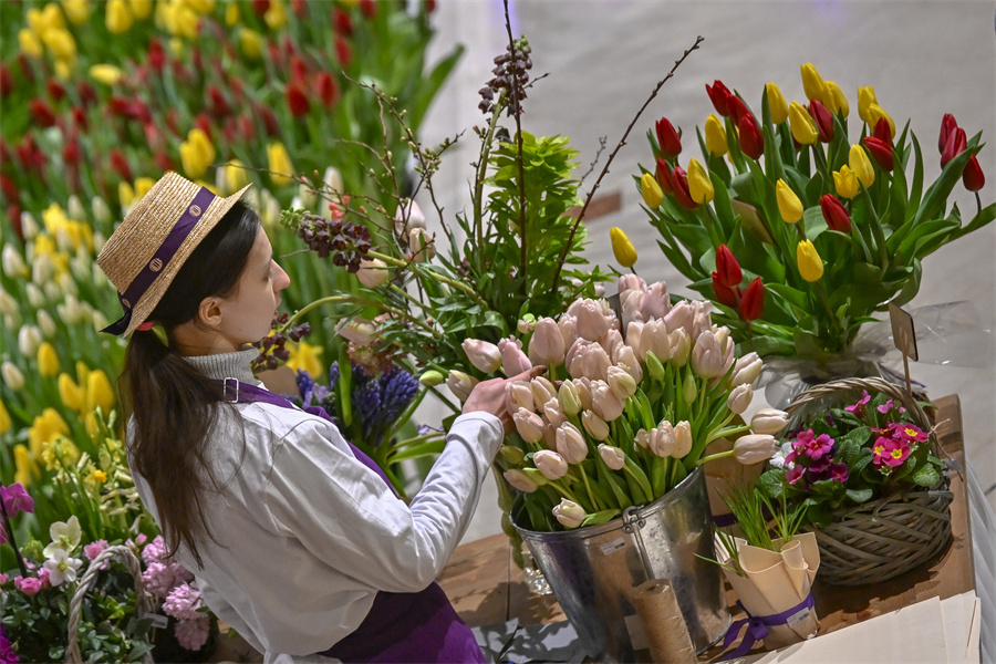 近日,俄罗斯莫斯科举行花卉博览会,迎接国际妇女节。