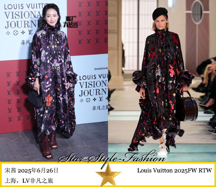 宋茜身着LV2025秋冬系列花卉印花紫色斗篷长裙亮相。裙子十分乌苏,这种情况下发型就应该尽量清爽,而不是这种故意营造的纷乱感披发。最后#丑鞋毁一身#