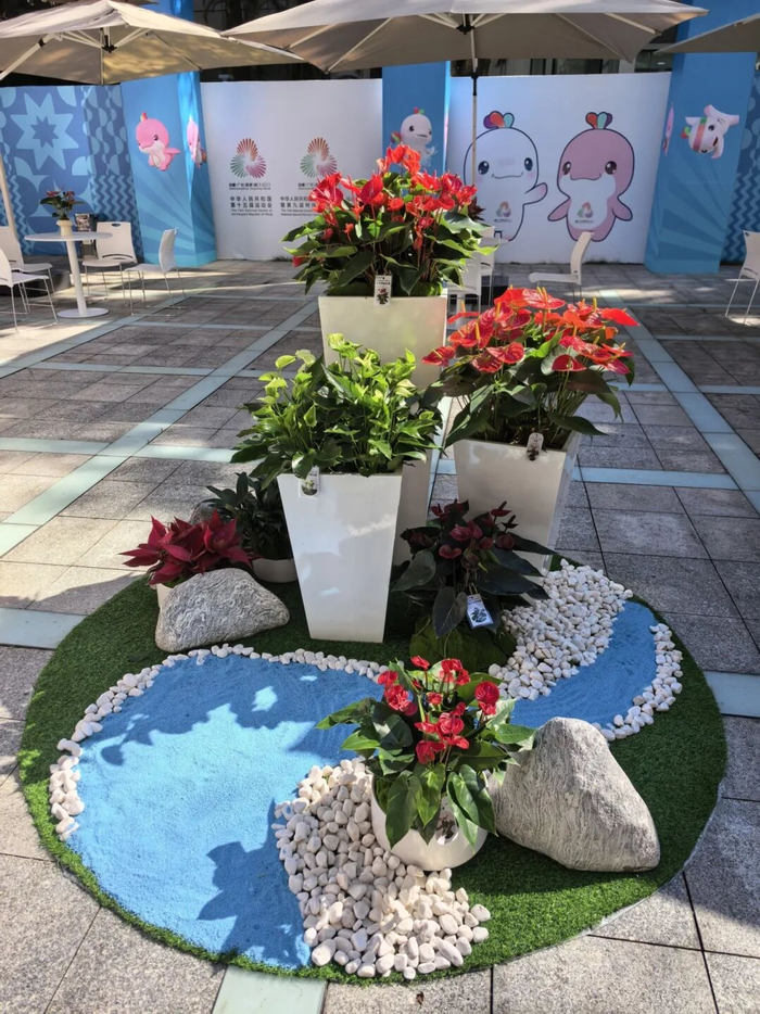 红掌传情,喜迎宾朋。在休息区内,广花公司还展示了多个红掌新优品种,如荣获全国“金花奖”的“小娇”(全国五朵金花之一),2019北京世界园艺博览会特等奖的“紫云”(广东共有16个),新推出的“翡翠”“小王子”“福瑞”“朝天娇”等,还有“广花红运”粗肋草,红色、紫色、绿色、咖啡色,寓意“吉祥如意”“紫气东来”“鸿运当头”,每一种色彩都承载着对赛事与城市的祝福,传递广东人民的热情祝愿。