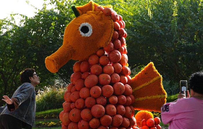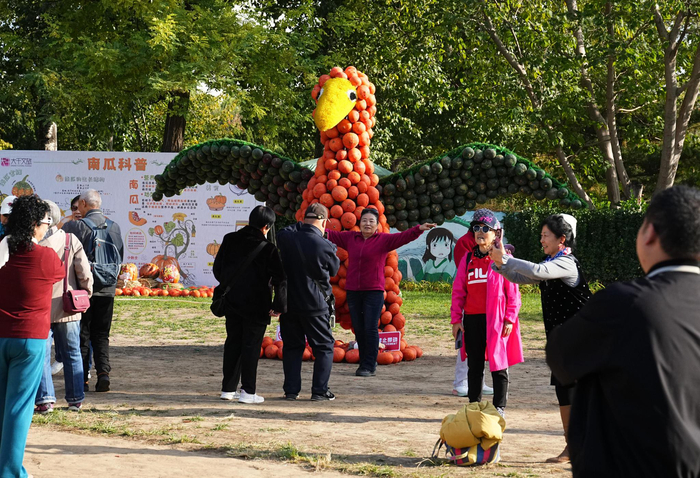 11月14日,游客在北京世界花卉大观园“2025北京巨型南瓜王国之梦回侏罗纪”展区游玩打卡,公园以近十万颗形态各异、色彩丰富的南瓜为核心材料,构建一个集大地艺术、侏罗纪奇境、亲子游乐于一体的沉浸式乐园。