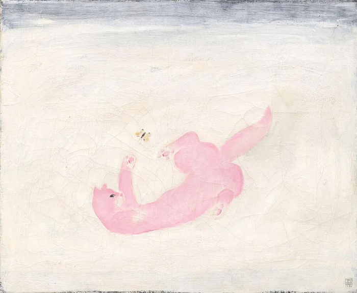 这是常玉1930年代动物系列的经典之作,画中粉嫩柔软的猫咪悠哉的横卧在地上,并戏耍着飞舞的彩蝶。