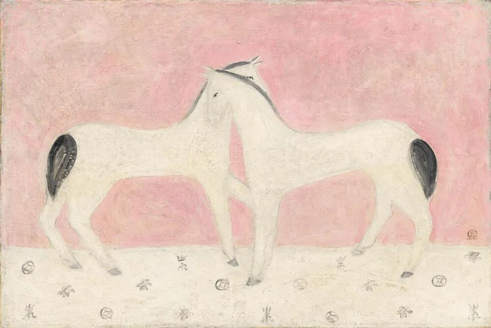 如同常玉笔下的花卉和人体,马的形象亦经过提炼、概括,沉静伫立的姿态,更强化符号性的表现。常玉对符号或装饰图案的着迷,明显可见于《双白马》这类作品。