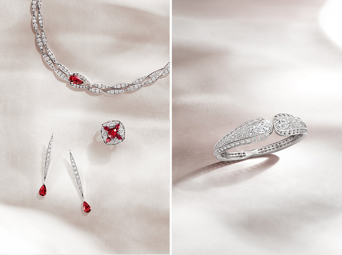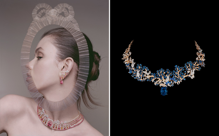 维多利娅从Milly-la-Forêt花园中繁茂的自然景致汲取灵感,结合工坊匠人的精湛技艺,打造出宛如蕾丝般繁复华丽的细腻质感,并融汇多种彩色宝石和珍贵材质,铺陈出一幅绚烂盛开的珠宝花园,尽显繁花似锦、各美其美的意境。