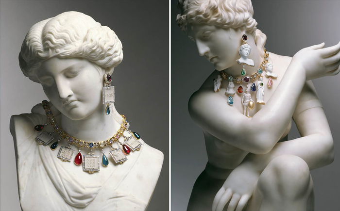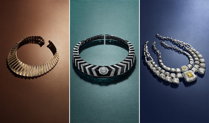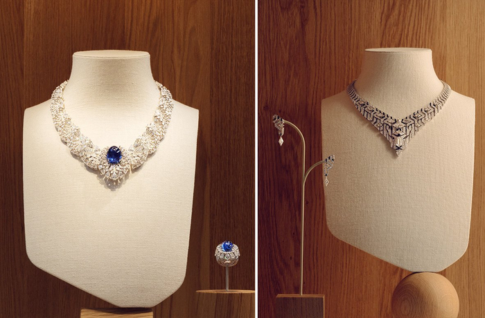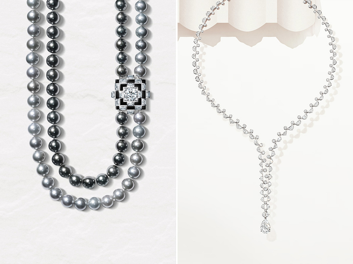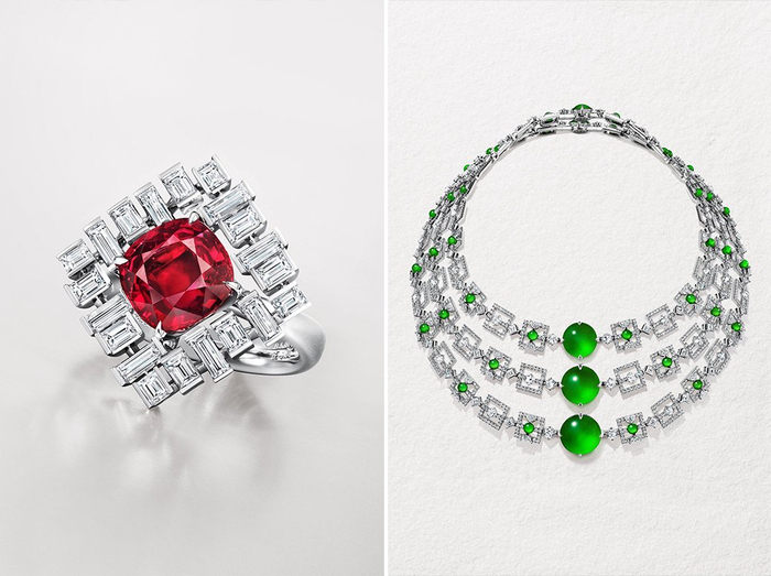 周大福“和美东方Timeless Harmony”高级珠宝系列,“宫宇御韵”(左)、“瓦影绘韵”作品