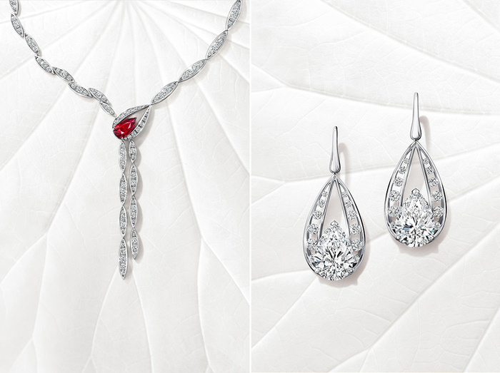 这一高级珠宝系列以“华夏美学,当代创绎”为核心定位,灵感源自于华夏哲学的深邃睿思与东方建筑的瑰丽意象,涵盖莲花、天地、喜乐、宫殿、门钉、古瓦、长城等灵感元素,并采用中西合璧的创作手法,织就出包括“莲华清韵”“天圆地方”“传喜”等不同主题共百余件高级珠宝臻作。
