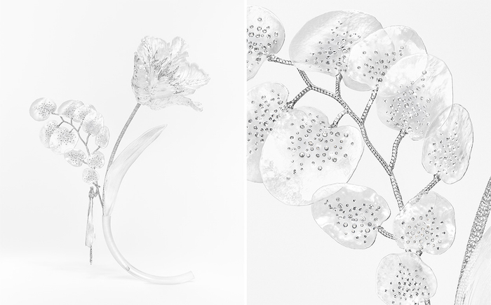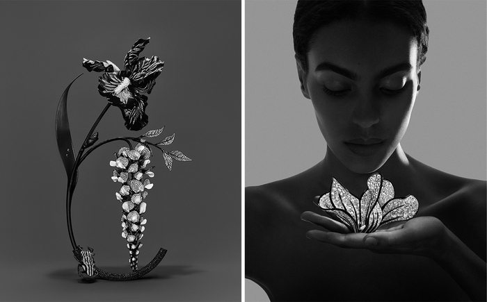 全新作品对写实的追求还体现在:将近700颗形态尺寸各异的玫瑰形切割钻石镶嵌于仙客来的白金花瓣上;鸢尾花绽放的花瓣在工匠探索多种深浅不一的黑色DLC涂层后,最终将不同质感的饰面并置以展现层次。整个系列秉承一饰多戴理念,从最明亮的第六组到最深邃的第一组,每组作品都诠释着自然逐渐消逝的轨迹。光影是贯穿共28件作品的全新高级珠宝系列主线:从充盈到渐隐,最终沉入漆黑——隐喻自然循环的终结。