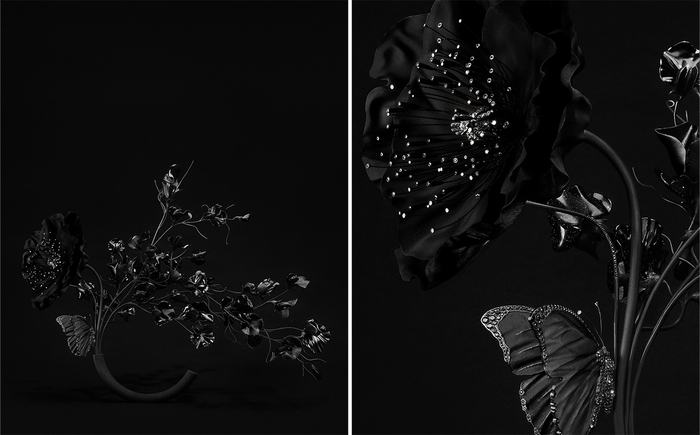 在以罂粟花、豌豆花和蝴蝶为设计元素的第一组作品中,罂粟花更蕴藏着整个系列最具创新性的工艺:花瓣采用哑光黑色钛金属打造,内侧手工雕刻出细腻的脉络纹理,并覆以Vantablack涂层——迄今为止人造颜色最暗的材料之一,能够吸收99.965%的光线。这种独特的处理方式营造出一种极具戏剧性的视觉效果,仿佛物质本身消融于虚无之中。