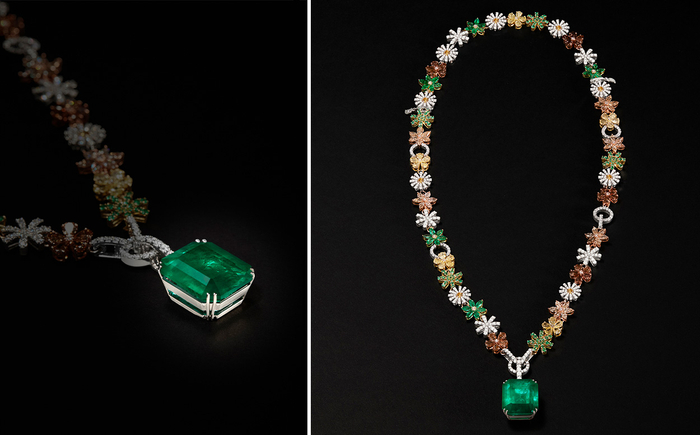 Dolce Stil Novo项链归属“灵境风华”篇章,设计仿若一首献给托斯卡纳丘陵的十四行诗,婉转铺展一条蜿蜒小径,野花于两则草地烂漫盛开。整件作品由白金、黄金与玫瑰金交织而成,形状各异的祖母绿与无色、黄色与棕色钻石以多种切割工艺镶嵌其中。主石为一颗重达31.46克拉、呈“木佐绿”色调的珍稀哥伦比亚祖母绿。花卉元素点缀其间,尤以雏菊最为醒目,意在致敬14世纪意大利诗人笔下那翩然脱俗的女性形象。