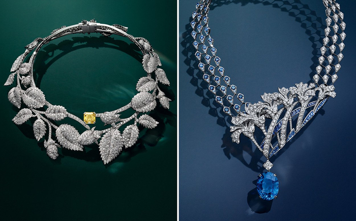 CHAUMET全新Jewels by Nature绿野芳踪高定珠宝套系,Sword Lily兰舞(左)、Fairy Iris鸢蓝主题作品