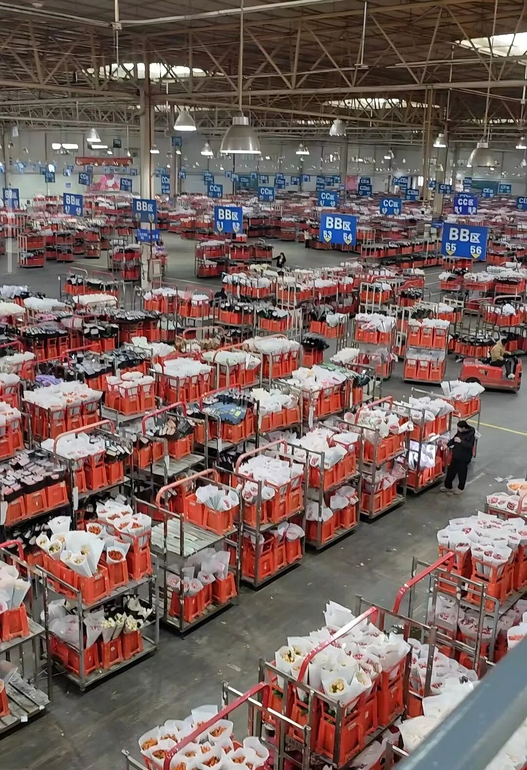 另一个仓库内,一排排装满鲜花的货架有序排列,这里摆放着已经过质检分级的鲜花。由一辆电动车头牵引的几十节移动货架,在一眼望不到头的仓库里穿行,犹如一列列“小火车”。“我们这里没有冷库,只提供矿泉水为鲜花保鲜,因为这些鲜切花当天就可以完成提货。”据交易中心工作人员介绍,每天有超过700万枝鲜花在这里完成交易。