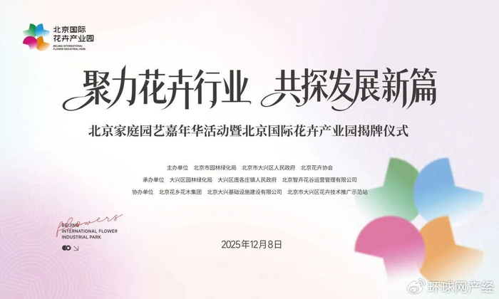 2025年12月8日,北京国际花卉产业园花园服务中心华光溢彩,北京家庭园艺嘉年华活动暨北京国际花卉产业园揭牌仪式在此盛大举行。该活动由北京市园林绿化局、大兴区人民政府、北京花卉协会联合主办。活动吸引100余名来自政府部门、科研院所、高校、企业、社会团体及媒体的代表共同参与。