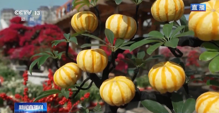 此外,这里还有一些很有创意的花卉,比如这盆“金瓜”。在闽南语里,南瓜被称为“金瓜”,寓意着新的一年生活“顶呱呱”;还有三角梅,通过嫁接技术,一株能开出好几种颜色,呈现出“万紫千红”的景象;以及挂满红果子、喜庆十足的小冬青,也都是市场的亮点。