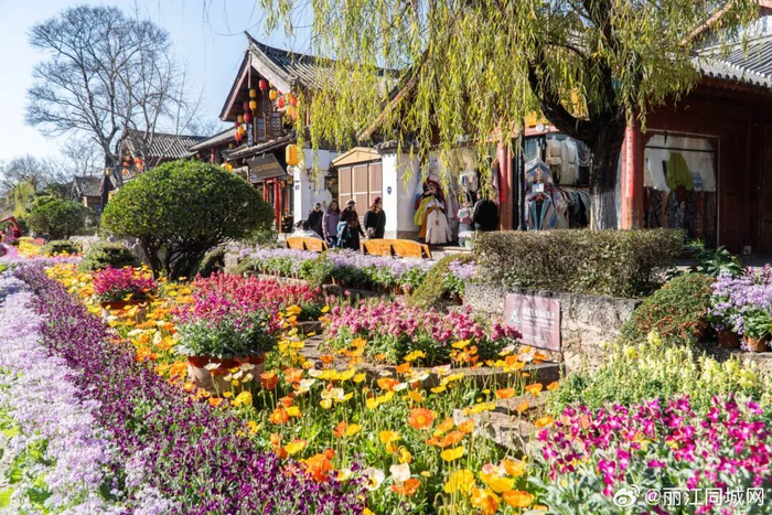 #舍不得的丽江#自大水车起始,四万余盆各色花卉已沿着玉河广场、东大街、四方街至大石桥一路铺陈,宛如一条流动的花之河,将古城装点得明媚动人。